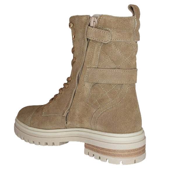 Een aanwinst aan je schoenencollectie is deze bikerboot van het merk GIGA. Deze nubuck bikerboot is uitgevoerd in een prachtige beige kleur. Opvallend zijn de fraaie stiksels en de goudkleurige accenten zoals de gesp, de veterringen en de sierrits. Deze hippe boots zijn eindeloos te combineren onder een jurk, rok, broek of een stoere jeans. De binnenvoering van deze schoen is van leer en het lederen voetbed is uitneembaar. Kortom, een makkelijk te combineren schoen met een perfecte pasvorm.