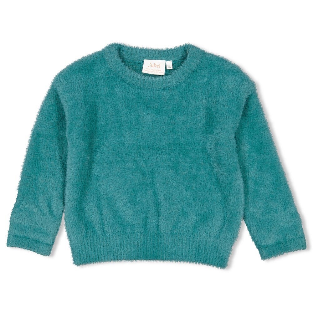 Gebreide trui van het merk JUBEL in de kleur teal. Deze mooie gebreide sweater uit het thema Girls Club is gemaakt van zachte viscose.