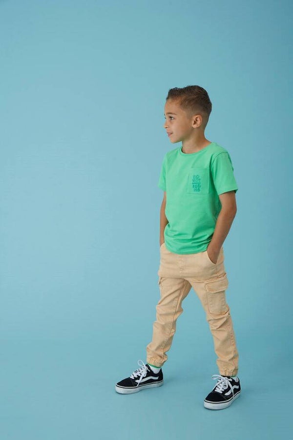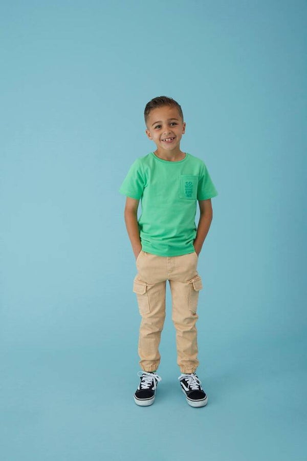 Stoere denim cargo broek van het merk STURDY. De broek, uitgevoerd in de kleur zand, heeft elastische boorden en een elastisch verstelbare tailleband, waardoor deze altijd mooi past.