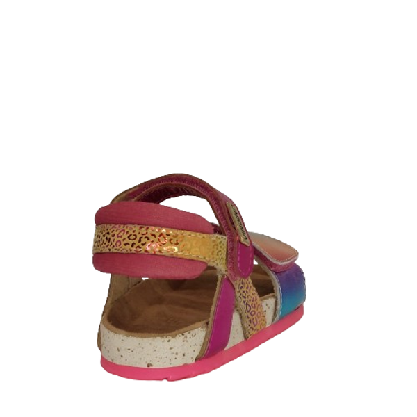 Deze kleurrijke VINGINO sandaal voor de kindjes heeft een licht gevormd voetbed en is uitgevoerd in metallic pink. De band voorop heeft een multicolor rainbow print en is te verstellen door middel van een klittenband. De band om de enkel heeft eveneens een klittenbandsluiting waarme je de sandaal makkelijk aan en uit trekt. Het zachte licht gevormde voetbed in combinatie met de kurken tussenzool biedt het juiste comfort. De rubberen loopzool zorgt voor een goede grip.