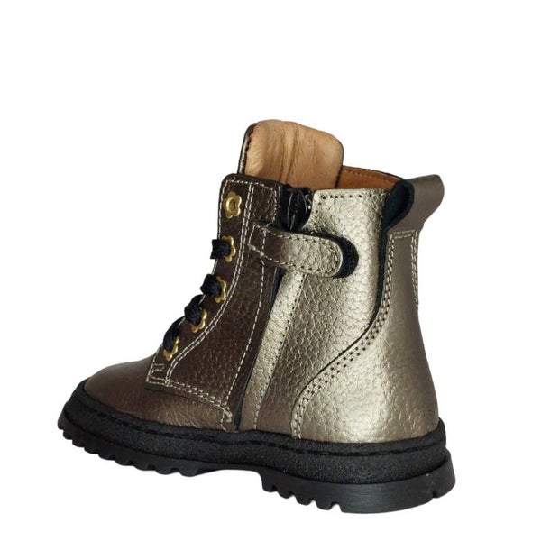 Wie wordt er nou niet verliefd op deze stoere lederen veterbooties met ritssluiting van het merk DEVELAB? Een flexibele veterboot voor de allerkleinste kids. Deze veterboot, met soepele rubberzool, is uitgevoerd in goud metallic nappa leer. Opvallend zijn de goudkleurige glitter hartjes op de schacht van de schoen. De binnenvoering van deze schoen is van leer en het lederen voetbed is uitneembaar.