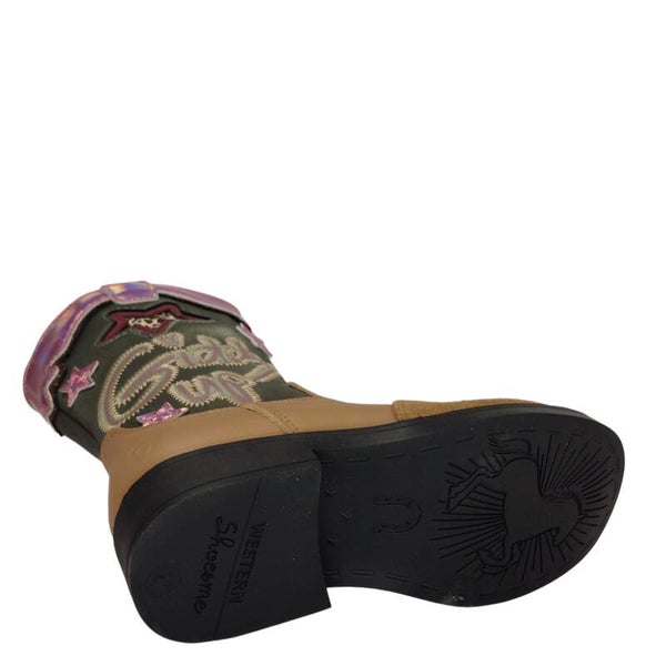 Giddy Up! Ben je op zoek naar de perfecte cowboylaars voor jouw kind? Zoek niet verder! Deze trendy cowboylaarzen van SHOESME zijn speciaal ontworpen om jouw kind te laten stralen. Deze laars heeft een metallic schacht en een supergaaf groen met roze design. De rubberen zool met subtiele hak maakt de laars helemaal af, want welk kind wil nou niet op een hakje lopen?