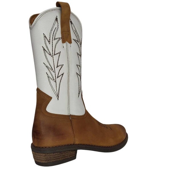 Western! De trend!! Deze stijlvolle nubuck western laars van het merk 4REBLES is uitgevoerd in de kleur cognac. Opvallend en stoer is de lichte kleur schacht en de stoere stiksels op deze cowboy laars. Deze laars is makkelijk te combineren bij alle outfits en heeft een bijzonder mooie pasvorm. De binnenvoering van de laars is volledig van leer en het lederen voetbed is uitneembaar. Uiteraard is deze westernlaars (met hak) geschikt voor de kids die nog volop in de groei zijn.