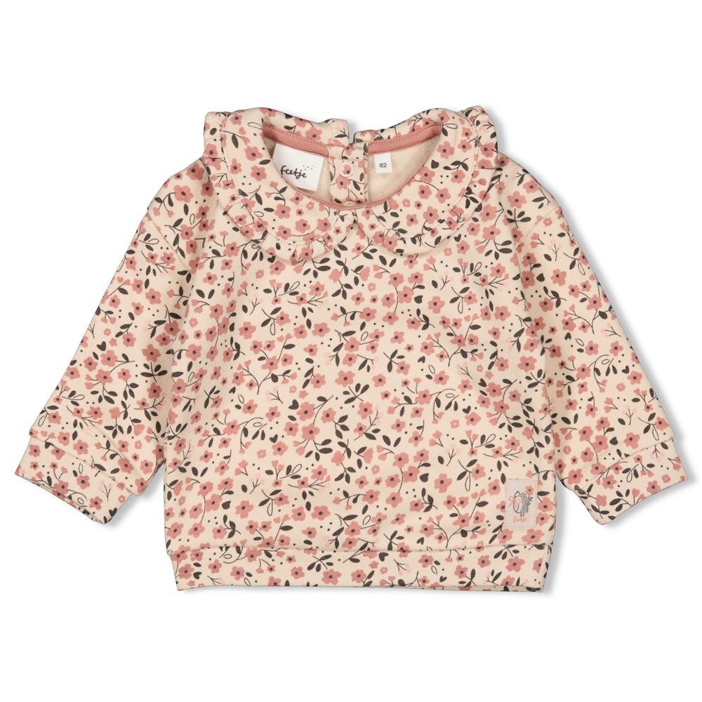 Sweater met drukknoopjes van het merk FEETJE. De offwhite kleurige sweater is voorzien van een all-over bloemenprint uit het thema Woodland Bloom. Door de handige drukknoopjes aan de achterkant is deze sweater met lange mouw makkelijk aan te trekken.