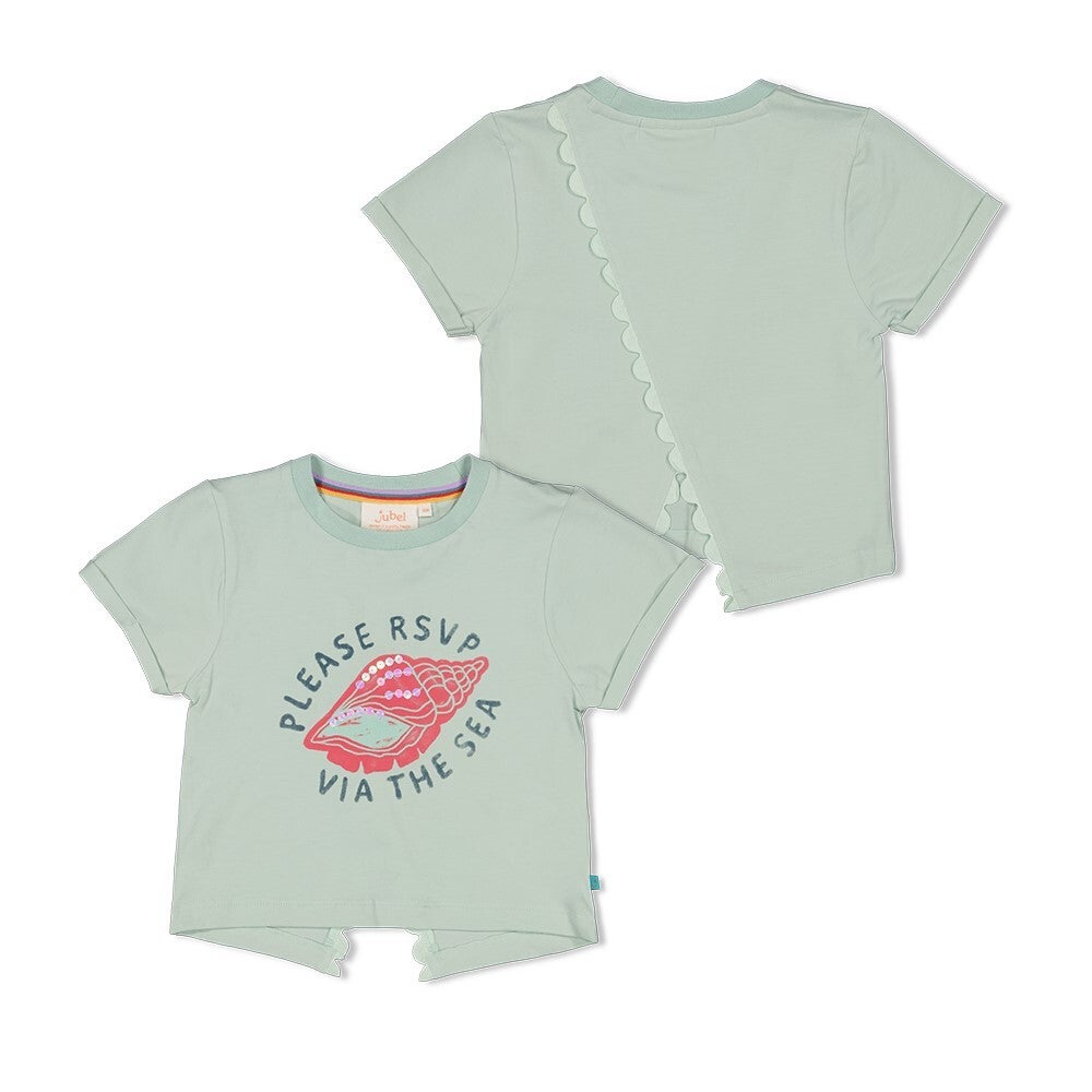 Maak elke zomerdag een feestje met dit prachtige mintgroene Jubel T-shirt uit de "Lazy Lagoon" collectie! Dit shirt is een echte blikvanger voor kids die van details houden. De voorzijde schittert door een schattige opdruk met pailletten, terwijl het fraai uitgewerkte rugpand zorgt voor een verrassend en luchtig effect.